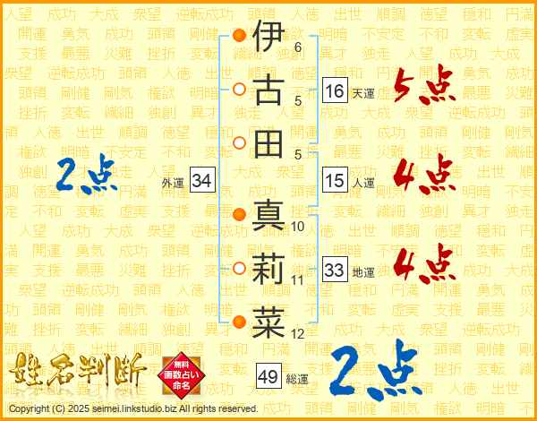 伊(6画)古(5画)田(5画) 真(10画)莉(11画)菜(12画)