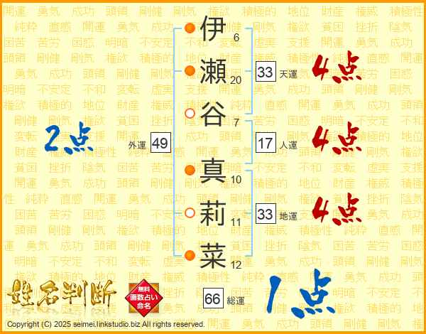伊瀬谷真莉菜さんの天運は33画の4点!