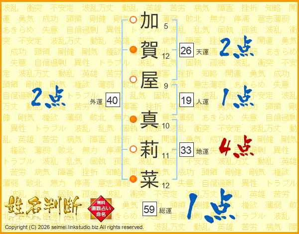 加(5画)賀(12画)屋(9画) 真(10画)莉(11画)菜(12画)