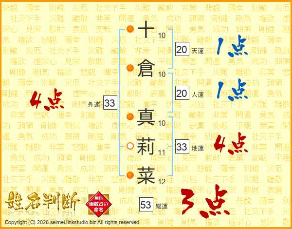 十(10画)倉(10画) 真(10画)莉(11画)菜(12画)