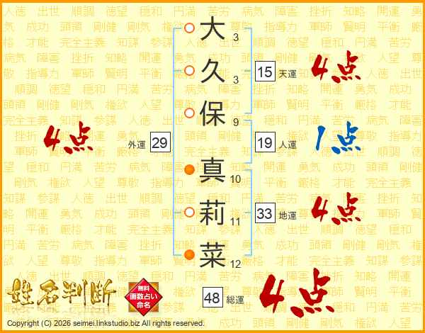 大(3画)久(3画)保(9画) 真(10画)莉(11画)菜(12画)