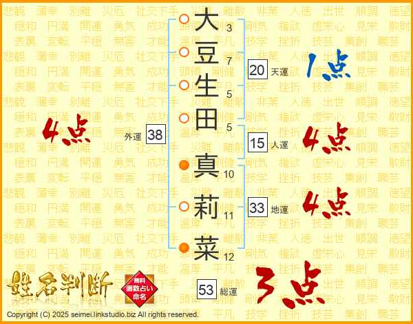 大(3画)豆(7画)生(5画)田(5画) 真(10画)莉(11画)菜(12画)