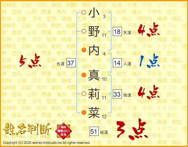小(3画)野(11画)内(4画) 真(10画)莉(11画)菜(12画)