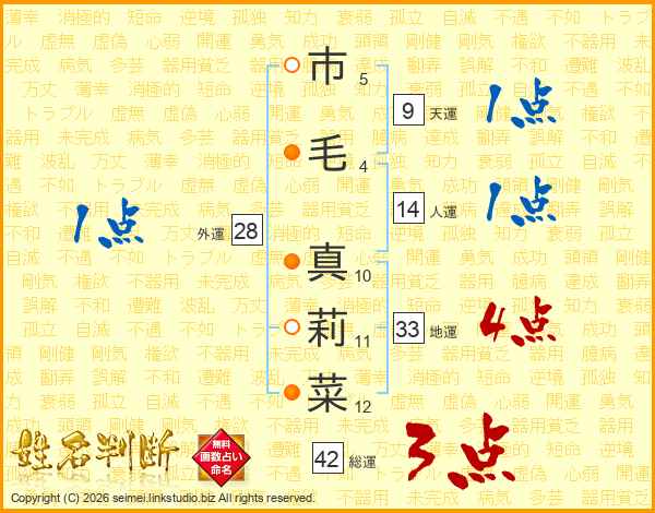 市(5画)毛(4画) 真(10画)莉(11画)菜(12画)