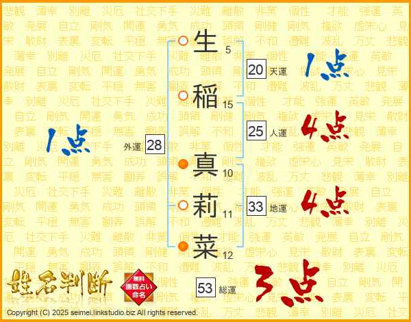 生(5画)稲(15画) 真(10画)莉(11画)菜(12画)