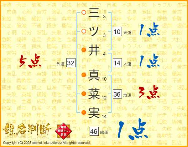三(3画)ツ(3画)井(4画) 真(10画)菜(12画)実(14画)