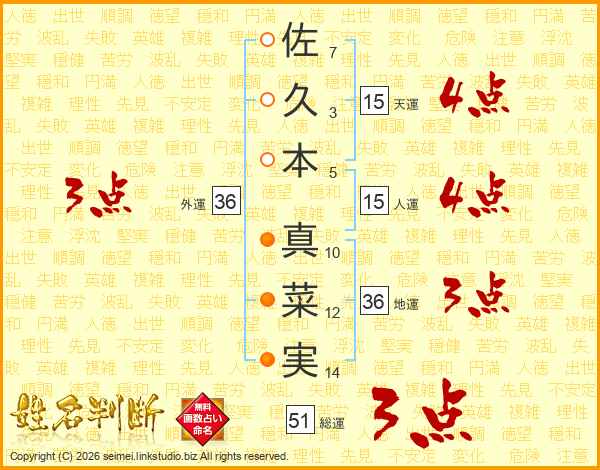佐(7画)久(3画)本(5画) 真(10画)菜(12画)実(14画)