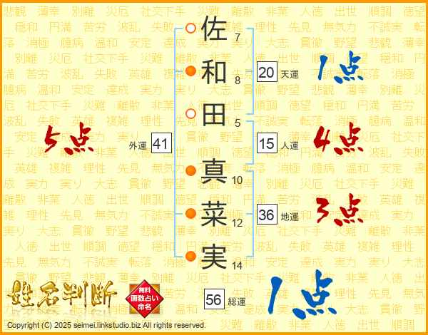 佐(7画)和(8画)田(5画) 真(10画)菜(12画)実(14画)