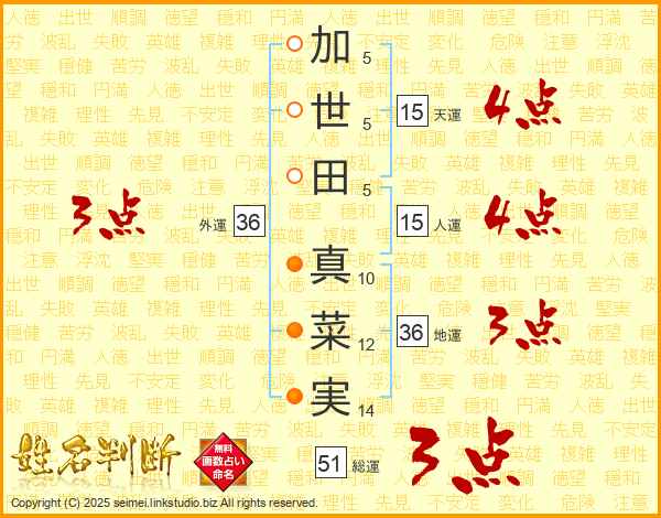 加(5画)世(5画)田(5画) 真(10画)菜(12画)実(14画)