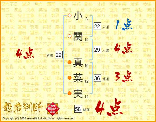 小(3画)関(19画) 真(10画)菜(12画)実(14画)