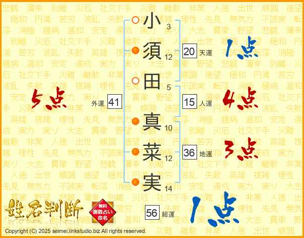 小(3画)須(12画)田(5画) 真(10画)菜(12画)実(14画)