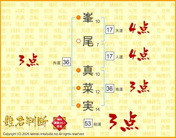 峯(10画)尾(7画) 真(10画)菜(12画)実(14画)