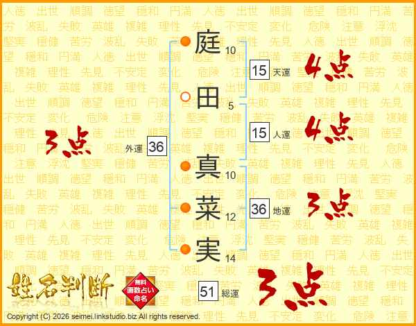 庭(10画)田(5画) 真(10画)菜(12画)実(14画)