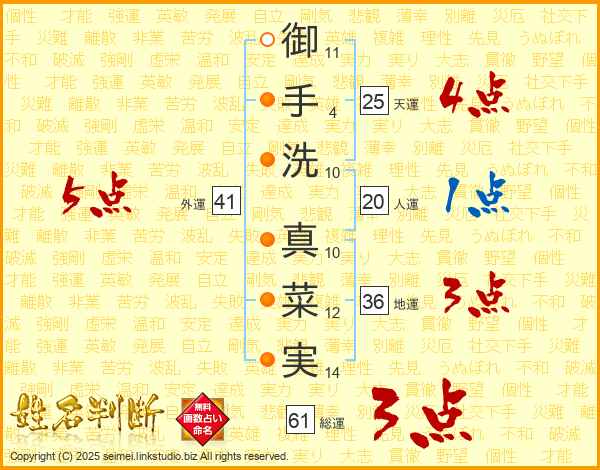 生活面を象徴する運勢です。外部から受ける影響力を表し、結婚運、家庭運や職場、環境への順応性を表します。総運から人運を引いた画数。姓や名が1文字の場合を除く。