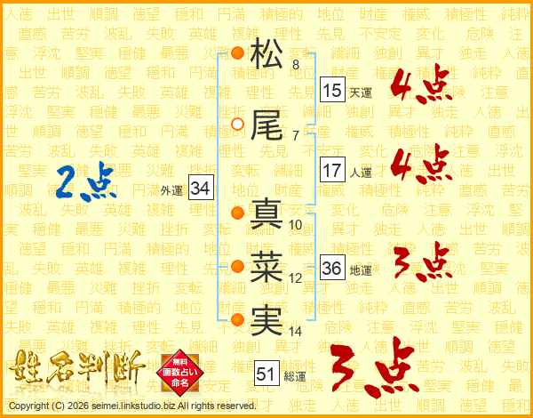 松(8画)尾(7画) 真(10画)菜(12画)実(14画)