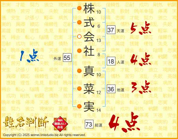 株(10画)式(6画)会(13画)社(8画) 真(10画)菜(12画)実(14画)