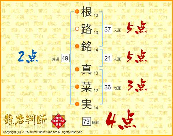 根(10画)路(13画)銘(14画) 真(10画)菜(12画)実(14画)