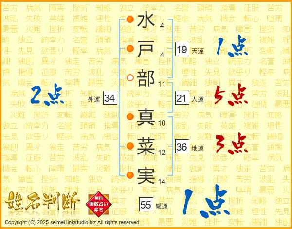 水(4画)戸(4画)部(11画) 真(10画)菜(12画)実(14画)