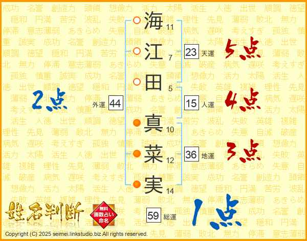 海(11画)江(7画)田(5画) 真(10画)菜(12画)実(14画)