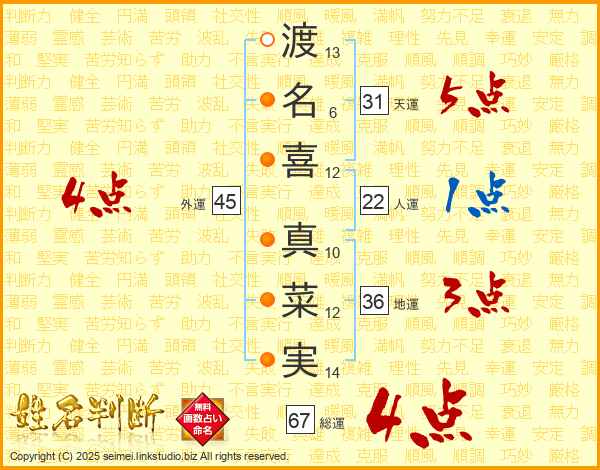 渡(13画)名(6画)喜(12画) 真(10画)菜(12画)実(14画)