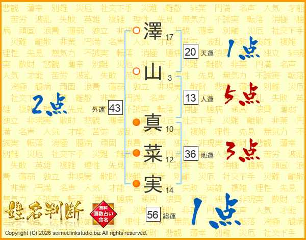 澤(17画)山(3画) 真(10画)菜(12画)実(14画)