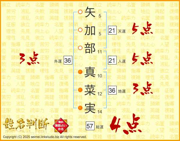 矢(5画)加(5画)部(11画) 真(10画)菜(12画)実(14画)