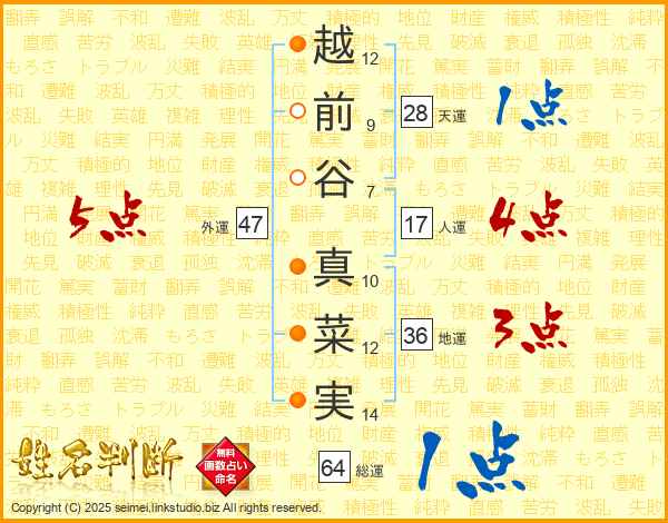 生活面を象徴する運勢です。外部から受ける影響力を表し、結婚運、家庭運や職場、環境への順応性を表します。総運から人運を引いた画数。姓や名が1文字の場合を除く。