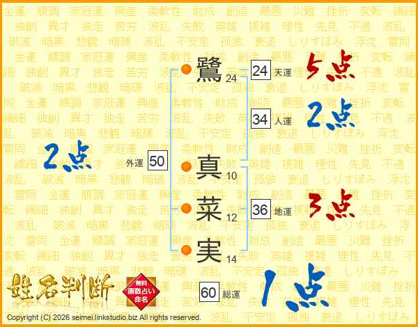 鷺(24画) 真(10画)菜(12画)実(14画)