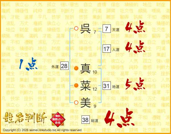 生活面を象徴する運勢です。外部から受ける影響力を表し、結婚運、家庭運や職場、環境への順応性を表します。総運から人運を引いた画数。姓や名が1文字の場合を除く。