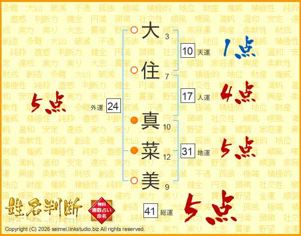 大(3画)住(7画) 真(10画)菜(12画)美(9画)