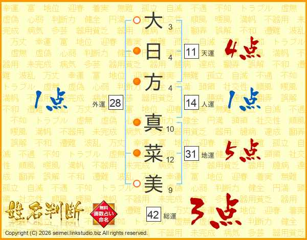 大(3画)日(4画)方(4画) 真(10画)菜(12画)美(9画)