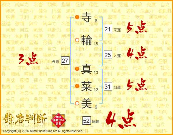 寺(6画)輪(15画) 真(10画)菜(12画)美(9画)