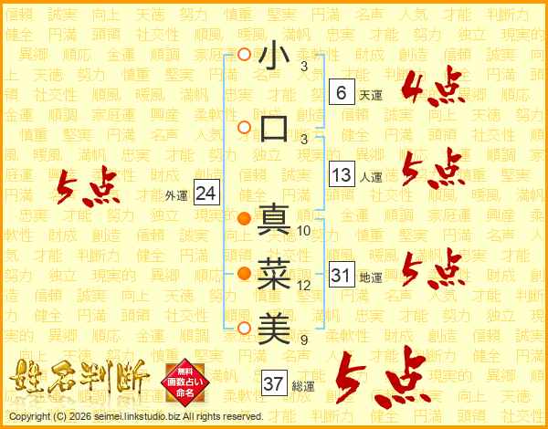小口真菜美さんの総運は37画の5点!