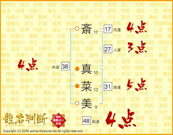 斎(17画) 真(10画)菜(12画)美(9画)