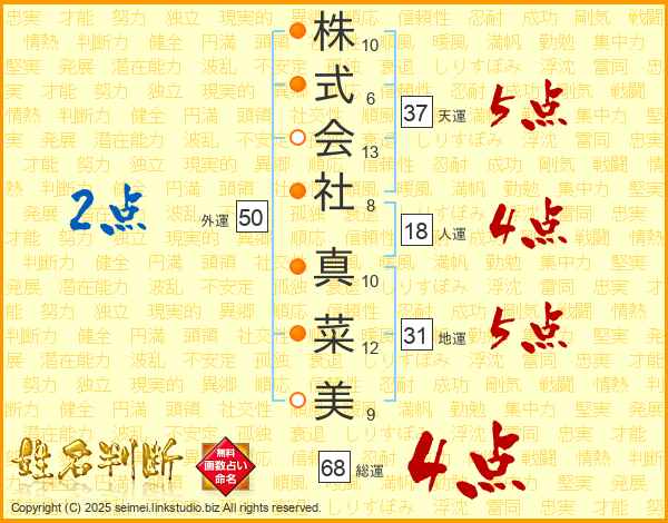 株(10画)式(6画)会(13画)社(8画) 真(10画)菜(12画)美(9画)