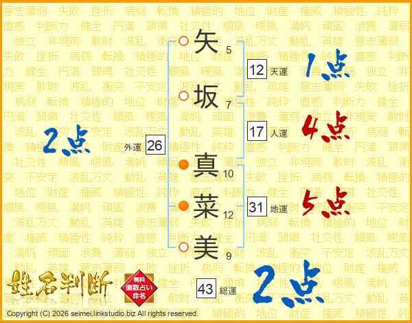 矢坂真菜美さんの総運は43画の2点!