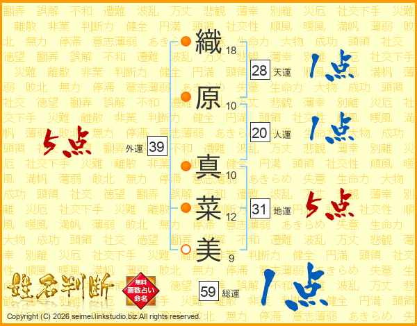 織(18画)原(10画) 真(10画)菜(12画)美(9画)