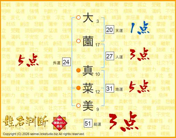大(3画)薗(17画) 真(10画)菜(12画)美(9画)