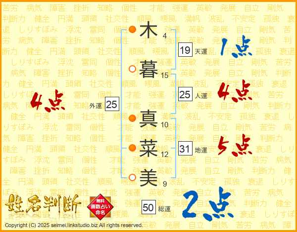 木(4画)暮(15画) 真(10画)菜(12画)美(9画)
