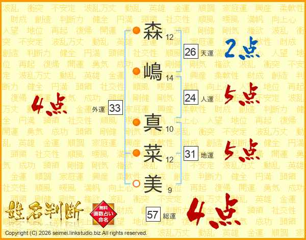 森(12画)嶋(14画) 真(10画)菜(12画)美(9画)