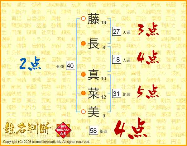 藤長真菜美さんの総運は58画の4点!
