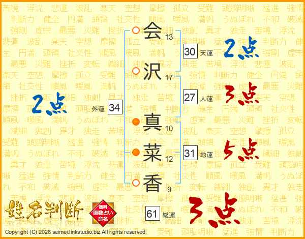 会(13画)沢(17画) 真(10画)菜(12画)香(9画)