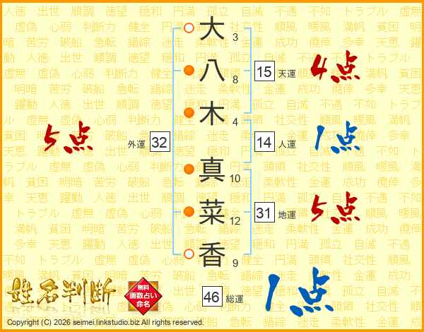 大(3画)八(8画)木(4画) 真(10画)菜(12画)香(9画)