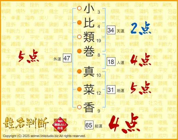 小(3画)比(4画)類(19画)巻(8画) 真(10画)菜(12画)香(9画)