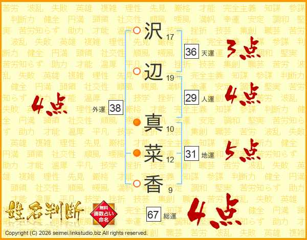 沢(17画)辺(19画) 真(10画)菜(12画)香(9画)