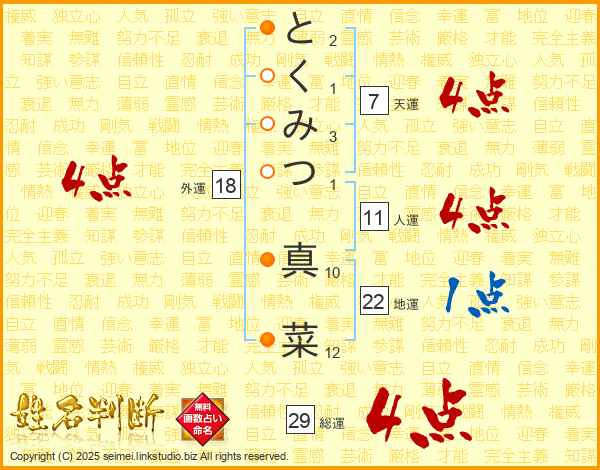 と(2画)く(1画)み(3画)つ(1画) 真(10画)菜(12画)