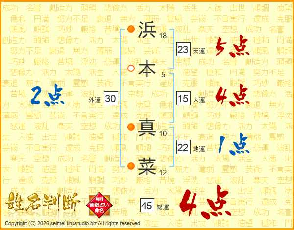 浜(18画)本(5画) 真(10画)菜(12画)