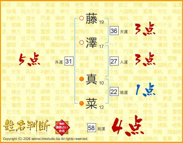 藤(19画)澤(17画) 真(10画)菜(12画)