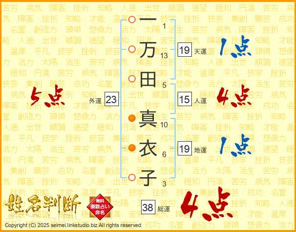 一万田真衣子さんの総運は38画の4点!