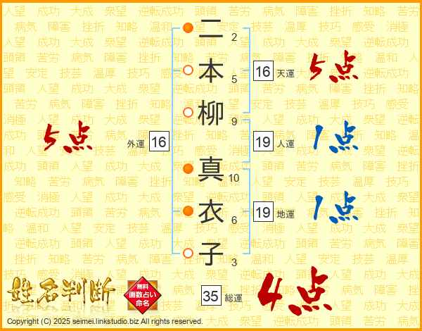 あなたの人生を表す1番重要な運勢です。生涯を通じて影響する総合運となり、主に50歳以降の晩年期に影響を及ぼします。苗字と名前の合計画数。